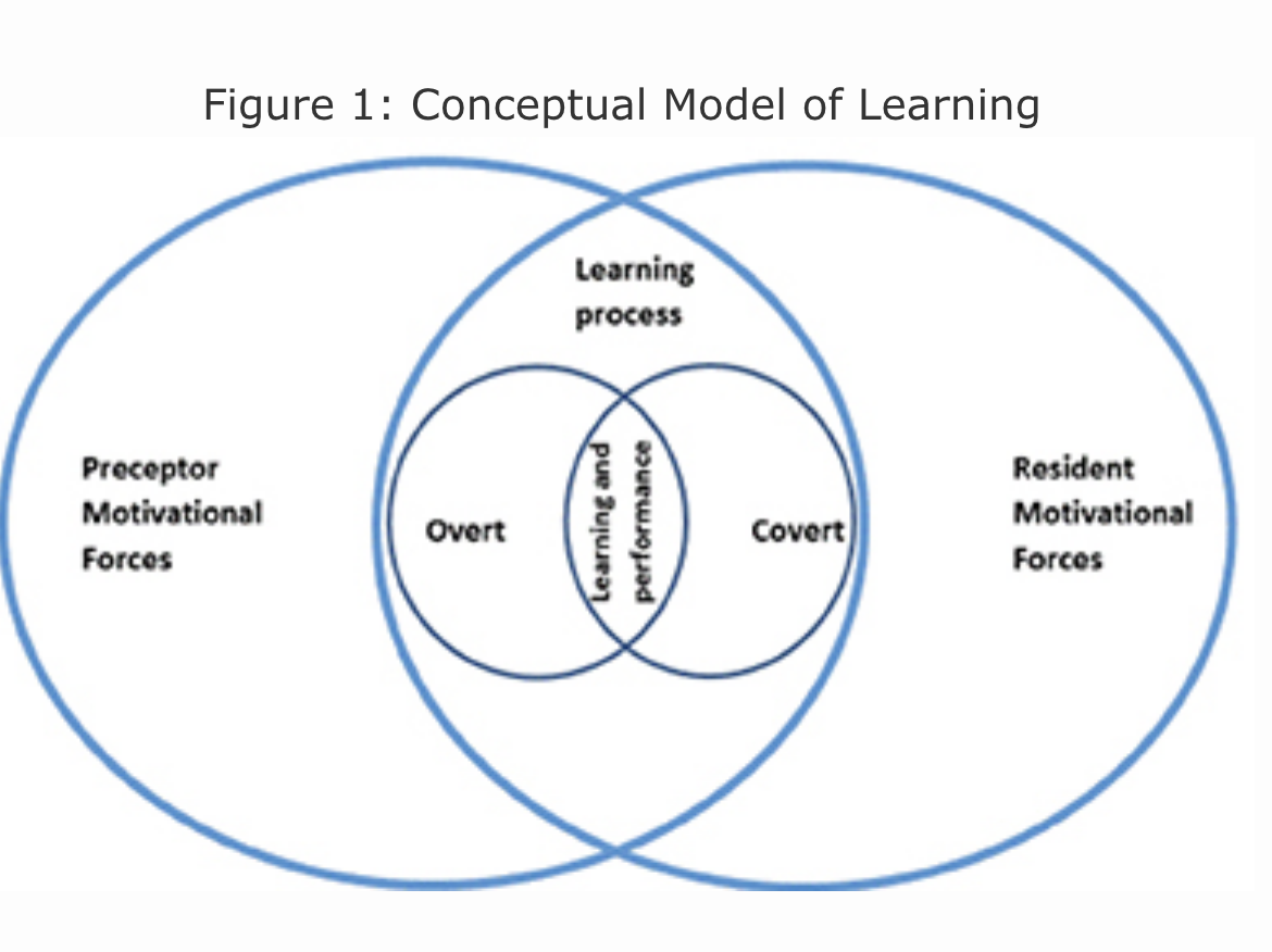We further grouped these themes by covert and overt motivational forces to generate a model of learning (Figure 1). This model recognizes the impact of these forces brought by residents and faculty to precepting, which in turn influences learning and performance. Covert forces are motivations not readily shared aloud. For instance, residents reported wanting to complete precepting quickly, resulting in them being strategic in their choice of preceptor. Residents reported preferring a preceptor who was quick and one who knows the patient’s background already. Additionally, residents reported already knowing what they wanted to learn from the preceptor for a patient encounter. They did not attend as much to precepting after that information was gathered. Overt forces include stated factors that impact learning. For example, a resident might state they have two patients waiting and ask that precepting finish quickly. It is important for both residents and preceptors to utilize strategies to better communicate needs during precepting and check in with each other to make sure the receiver is getting the intended message.