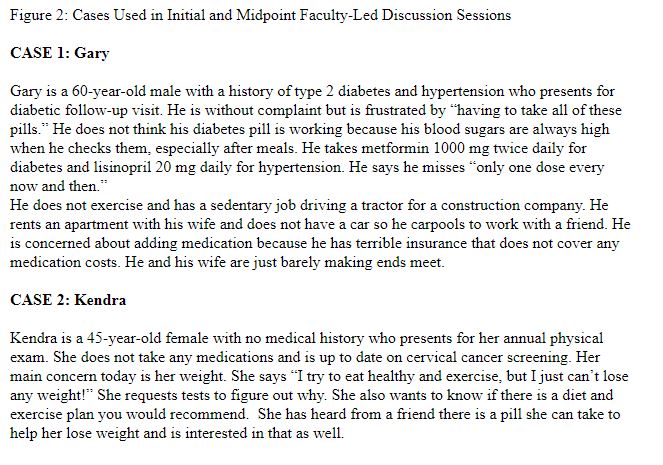 female trying to lose weight (Figure 2). The students are asked to reflect on the findings of their community needs assessment as they pertain to each case. For example, if they found gyms or grocery stores to be scarce that might make adherence to diabetic guidelines or weight loss challenging. Finally, at the end of the FMC students convene on campus for a final faculty-led feedback session. The same survey given at the beginning of the clerkship is again administered.