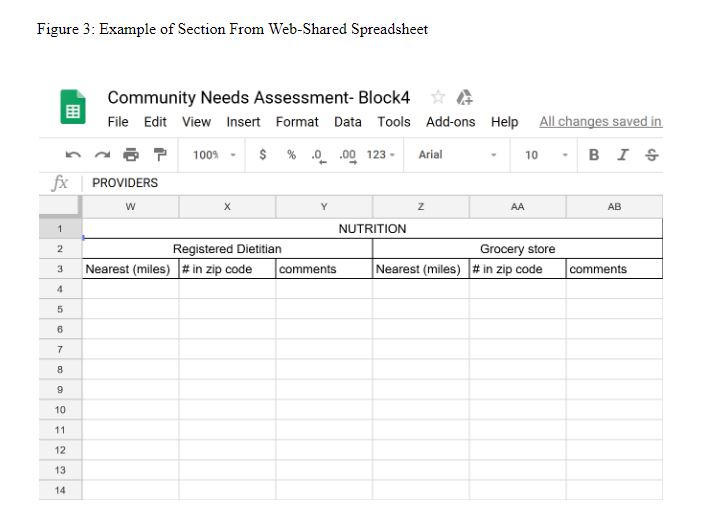 Over the course of the FMC, students complete the remainder of the spreadsheet, which includes information about various health-related resources including specialty care, nutrition, physical activity, health care delivery, and community infrastructure. For each item, they identify the nearest resource in miles from the practice, and the number of resources offered within their zip code. While some information can be gathered from an internet search, students are encouraged to dig deeper. Students have gathered such information as provider insurance acceptance, facility fees, and safety of community resource locations. Students are specifically instructed to visit the nearest grocery store and green space, and to take public transportation to work at least one day of their rotation.