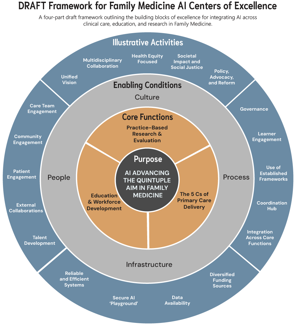 AI is reshaping health care at a breakneck pace. From reducing administrative burdens to enabling next-generation clinical decision support, AI is transforming how care is delivered, coordinated, and experienced. Family medicine has been part of this transformation from the start, shaping how AI advances equity, access, and whole-person care.Over the past 4 years, the family medicine organizations have laid essential groundwork to build AI capacity across the discipline. In 2021, the American Board of Family Medicine (ABFM) and the Center for Professionalism and Value in Health Care convened an AI summit that brought together early thought leaders to explore opportunities and challenges related to AI in primary care. This catalyzed in 2022 the ABFM Foundation’s “Enterprise AI and Building Long-Term (EnAIBL) Capacity for FM” Initiative, a national collaborative supporting family medicine departments in strengthening the people, infrastructure, and processes needed to harness AI’s potential.In 2023, through an effort funded by the Gordon and Betty Moore Foundation and facilitated by ABFM, an AI Bootcamp series launched at the NAPCRG annual meeting. This was followed in 2024 by the development and dissemination of STFM's AI and Machine Learning for Primary Care (AiM-PC) Curriculum. Additional momentum came from the American Academy of Family Physicians (AAFP) and Rock Health AI Starfield Summit in May 2025, culminating in a Starfield Report that calls for a formalized “primary care innovation network” for AI.Aligned with this call, STFM’s AI in Medical Education Task Force — in collaboration with the Association of Departments of Family Medicine (ADFM) and with funding from the ABFM Foundation — is leading a multi-year initiative to establish a national framework for Family Medicine AI Centers of Excellence (CoE). The goal is to help organizations build, sustain, and integrate AI capacity across clinical care, education, and research, not as separate domains, but as integrated capabilities that reflect the breadth and impact of our discipline.