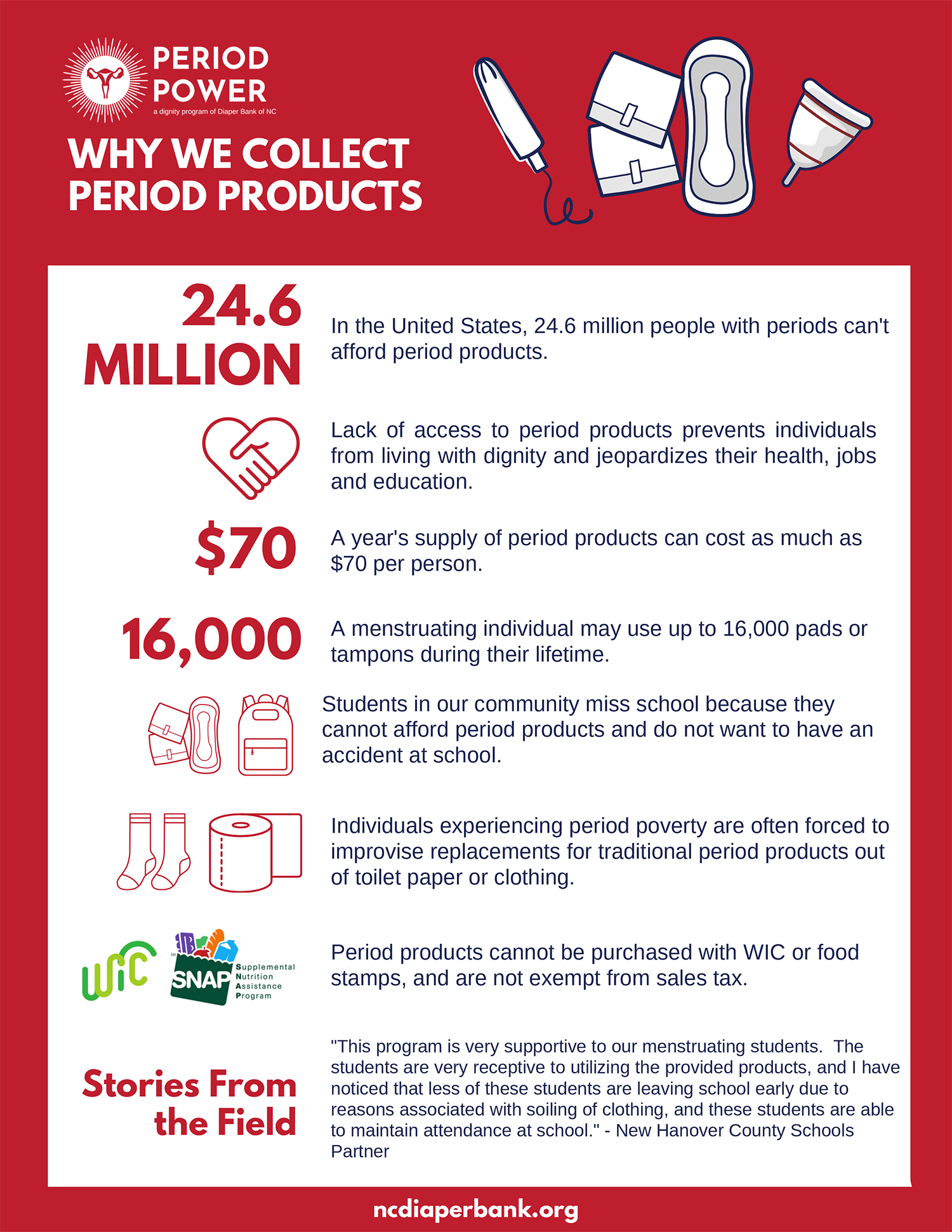 The Diaper Bank of North Carolina is addressing period poverty in the NC community through the Period Power initiative. Period Power allows existing community partners to offer period products to clients who may also be receiving diapers.