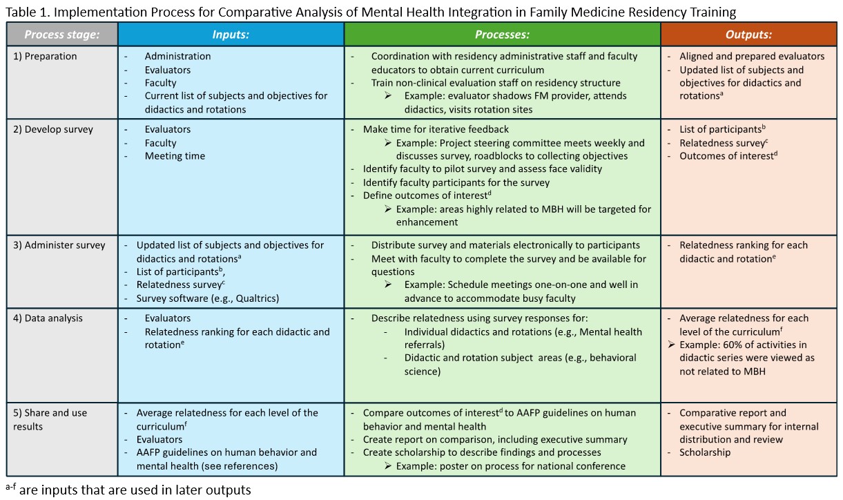 Family physicians play a major role in the provision of mental and behavioral health (MBH) care, and much of the training for this role occurs during residency.¹ Mental and behavioral health is a required component of the Accreditation Council for Graduate Medical Education (ACGME) guidelines for family medicine residency accreditation, and the American Academy of Family Physicians (AAFP) provides curriculum guidelines for human behavior and mental health for family medicine residencies.²,³ Some studies have explored the quality of MBH training for medical trainees, but these are often limited in scope and do not describe a process for compiling and systematically analyzing curricular content.⁴ This education column does not present results of such an analysis but instead describes a process for implementing a comparative analysis of MBH training in a family medicine residency program.